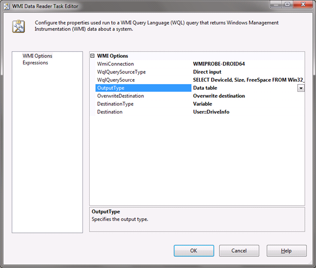 In the final installment of the Getting Drive Info series (Part 1, Part 2, Part 3, Part 4), SSIS will again be used to collect and save the drive information. This WMI Data Reader Task will be used to collect the drive information.