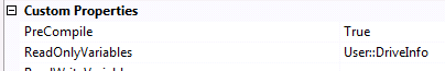 The ReadOnlyVariables property in the Custom Properties section needs to be set to User::DriveInfo so that the Data Table filled by the WMI Data Reader Task can be processed by the Script Component.