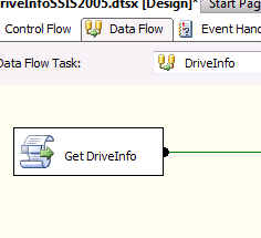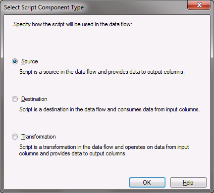 Switch over to the Data Flow designer pane and drag a Script Component object from the Data Flow Transformations section of the Toolbox. The Select Script Component Type will appear. The Script Component can be a source of data, a transformer of data or a consumer of data. Choose Source as this Script Component is going to provide drive information in a format that an Oledb provider can consume and click OK. Rename the Script Component Get DriveInfo. All of the images below came from BIDS 2005. BIDS 2008 is slightly different.