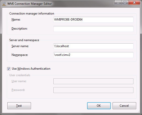 In the case where the server being queried for WMI data is not the computer the package is running on, credentials will need to be supplied. If the account that is running the package has access on this other computer, then checking Use Windows Authentication should work. When the other computer is in a different domain or the account running the package does not have access, then a windows user and password will need to be supplied. This can be a domain account or a local windows account on the other computer. Always supply the user name with a domain or the other computer name. In highly secure environments remote WMI security access may need to be configured on the other computer. WMI security configuration will not be covered here.