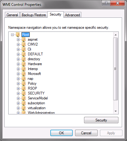 The Namespace property can usually be set to \root\cimv2. There will be cases when the WMI class to be queried is under a different WMI namespace. These other namespaces can be browsed WMI CMI Studio or Scriptomatic 2.0. I also recommend these tools to browse the classes available and see the properties and values. A sample of the namespaces available is shown below.