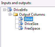 Double click on the Script Component to open the editor. In SQL Server 2008 the Script editor is the default. Click on Inputs and Outputs first to display that editor. Now let’s add some output columns. Rename Output 0 to DriveInfo and add the columns: