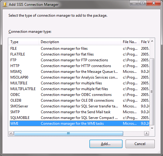 Select WMI and click the Add… button. The WMI Connection Manager Editor will be displayed.