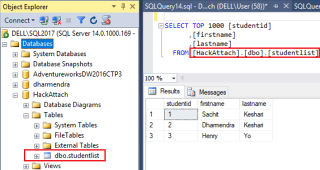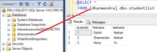 SELECT * FROM [dharmendra].dbo.studentlist- Verify the created database status, and check the inserted records. The below snapshot confirms that the database “dharmendra” got three records in the table “Studentlist”