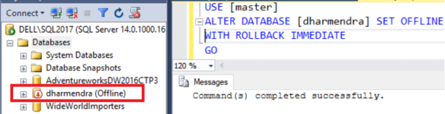 USE [master] ALTER DATABASE [dharmendra] SET OFFLINE WITH ROLLBACK IMMEDIATE GO