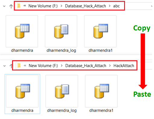 - Let’s copy & paste the database files to a different location. In this example, I am copying the files from the folder “F:\Database_Hack_Attach\dharmendra\” to “F:\Database_Hack_Attach\abc\”.