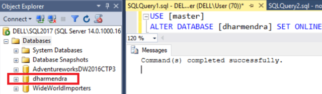 USE [master] ALTER DATABASE [dharmendra] SET ONLINE