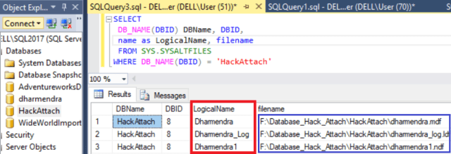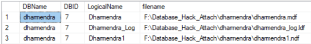 Here is the output of the above script. It confirms that the database “HackAttach” got the same logical name what the database “Dharmendra” has.