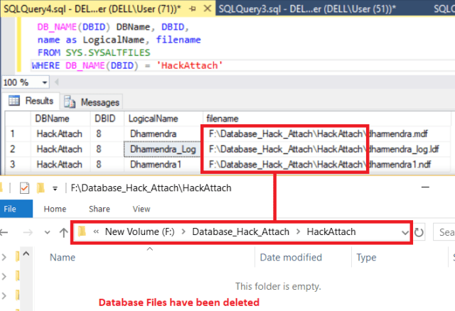 - Delete the database “HackAttach” files from the location “F:\Database_Hack_Attach\HackAttach\”