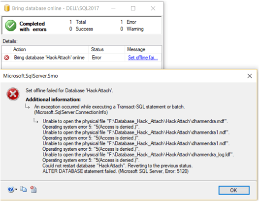 - Bring the database “HackAttach” online, you will encounter the error 5120.