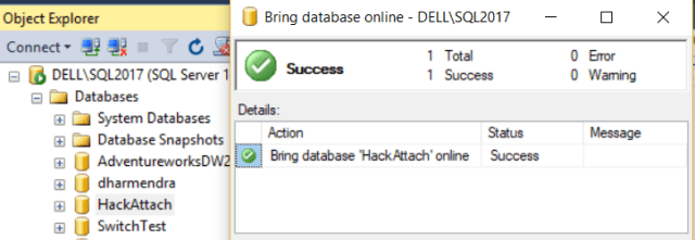 - Now, let’s bring the database “HackAttach” online.