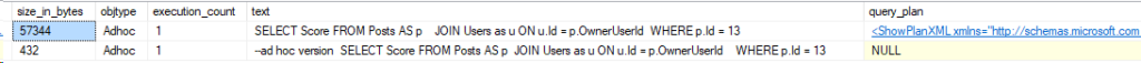 Okay, so this is as expected. The Adhoc query didn’t save the execution plan into cache, and the size is a lot smaller. But what if we didn’t replace 13 with the variable @PostId?