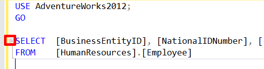 In the following screen shot, the indicated box is what you click to show / hide the selected region. In this case, if I were to click the box (which has a “-“ to indicate that it can be collapsed), the code would be collapsed to one line (for that region):
