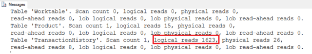 SET STATISTICS IO OFF- Once the insert operation completed successfully, the statistics details will show you that SQL Server did 1623 logical reads on the table [Production].[TransactionHistory]
