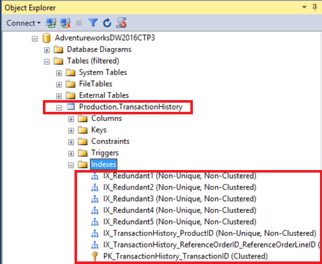 - I am going to use AdventureworksDW2016CTP3 database table [Production].[TransactionHistory]. It already has three indexes on it.