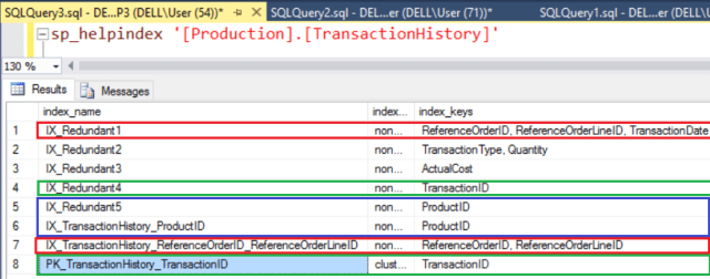 Now look at indexes “IX_Redundant1” & “IX_TransactionHistory_ReferenceOrderID_ReferenceOrderLineID”, they have trail in columns. I would again recommend you to remove the index “IX_TransactionHistory_ReferenceOrderID_ReferenceOrderLineID” so that query optimizer can use the second index “IX_Redundant1”.