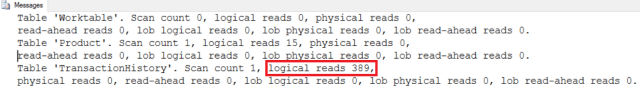 SET STATISTICS IO OFF- After completion of the insert operation, let’s verify the statistics details. Now, SQL Server did ONLY 389 logical reads on the table [Production].[TransactionHistory]