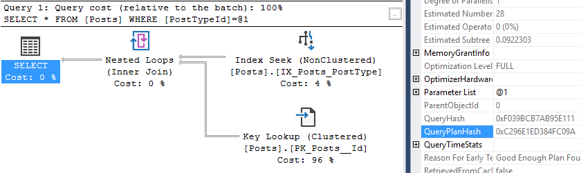 So we have the same query hash as the other two examples, and the same query plan hash as the first example. This time, with a slightly higher costs on the key lookup.