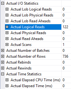 You can see that you have a full set of the Reads for the query. In this case, 122 logical reads and no physical reads (I’d run the query a couple of times getting things together for this blog post, so everything was in memory). At the bottom you can also see the Time measurements. In this case the value is zero, when measured in milliseconds.
