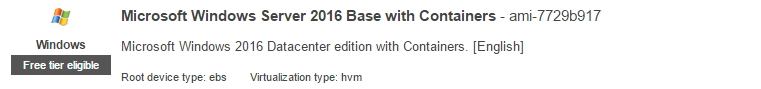 All my testing was done in AWS, and I picked the below AMI- Microsoft Windows Server 2016 Base with Containers