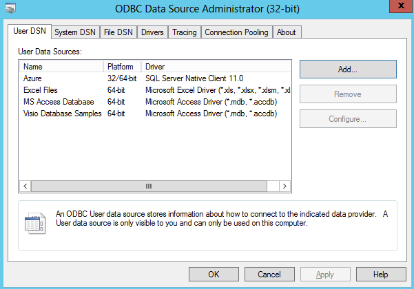 We create a blank MS Access 2013 database. Then through the ODBC connection console I need to add a new SQL Server connection: provide Server name for my SQL Azure database with account and password to access it (make sue to use a 32-bit version of the odbcad32.exe file, for some of the reasons the 64-bit version didn't allow me to create new DNS).
