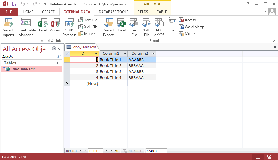 4) Then I create a new ODBC connection within the MS Access database for my dbo.TableTest table from the Azure; and after I accomplish this then I can see both the table and its data: