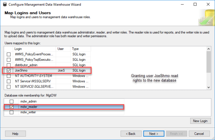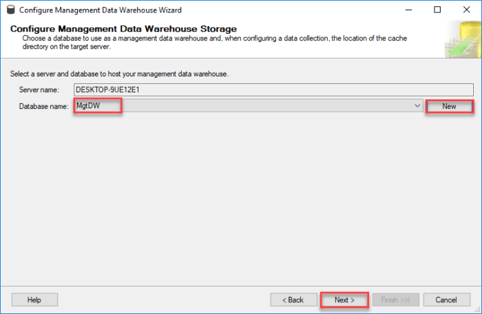 Here you need to choose your server you want to store your Data Collection Data. Then choose a database for your data. In this case I choose to create a new and named it MgtDW. Also, one Management Data Warehouse can act as central collection store to house all collections sets for multiple servers.