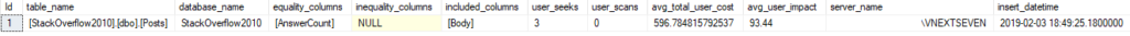 Excellent! So in the table name, we get the database name. We can also see the average user impact was logged directly from the execution plan I showed earlier.