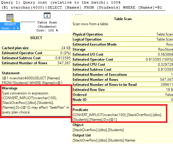 Implicit conversions are a problem when an entire column has to be converted. In the highlighted red box above, look at the CONVERT_IMPLICIT. It’s a function wrapped around the column, Names. When the correct data type is used down here at the bottom, it’s not an issue.