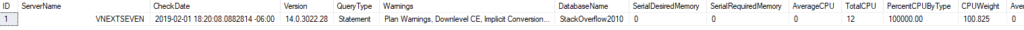 Among a lot of other information we’ve captured, we have both the query text and the query plan from cache, along with the CheckDate telling us when the plan cache was written to this table.