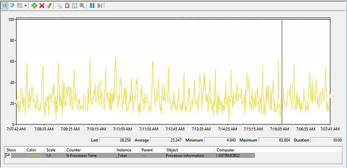 After changing the setting on all databases I run the perfmon.exe tool again and got the following Figure 4 for the average CPU usage.