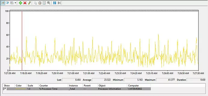 Figure 4. Measuring the CPU usage with the changed value (60) for TARGET_RECOVERY_TIME on an SQL Server 2014 instance.
