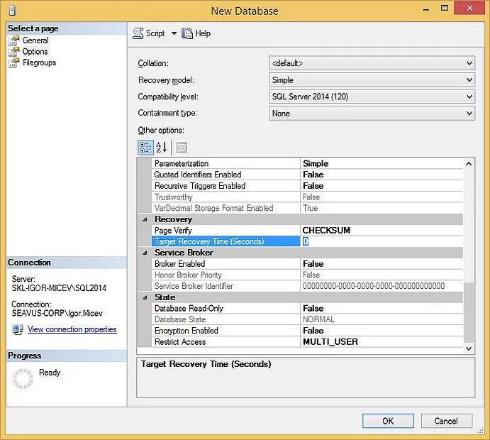 Figure 2. Target Recovery Time (Seconds) option set to 0 by default in a Create new database window in SQL Server 2014.
