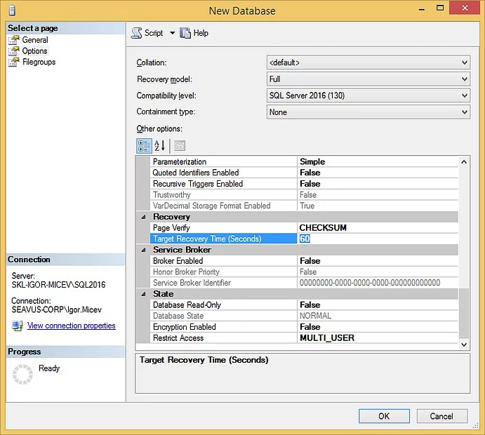 Figure 1. Target Recovery Time (Seconds) option set to 60 by default in a Create new database window in SQL Server 2016.