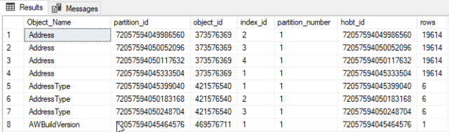 You can see partitions by doing a SELECT against sys.partitions. Using AdventureWorks2014, we can see below that the Person.Address table has a clustered index (Index_id = 1) and 4 non-clustered indexes on it. Every index has at least one partition, which is partition_number of one. If any object has multiple partitions, you’d see it there with a corresponding “partition_number” that is greater than one.