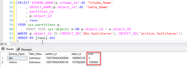 Because the switch is just metadata, it’s very quick. Less than a second to move all 1 million records from one table to the other. As you can see below, now the Archive.Switcharoo table has 1 million records and the dbo.Switcharoo table has zero.