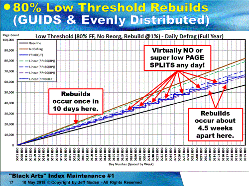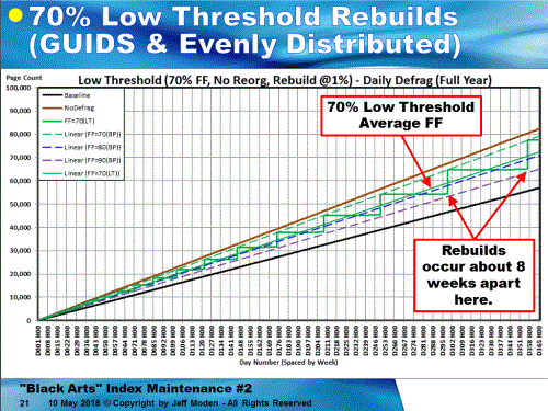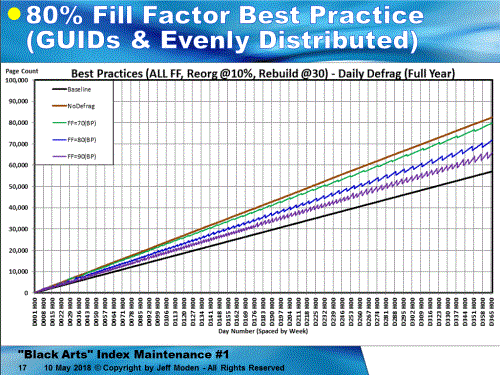 Of course, that's using ONLY rebuilds. If you use REORGANIZE, game over... Here's the chart for 70, 80, and 90% fill factors using standard "Best Practices", which lock in on the use of REORGANIZE because of the low percentage that 10K rows represents compared to 3.6 Million rows. The Black line is the "Baseline" where the GUIDs were inserted in ever-increasing order (like a NEWSEQUENTIAL ID). Any line segment steeper than that line contains not only the "good" page splits, but also the "bad" page splits where there's data movement. The Brown line is where no defragmentation was done for random inserts. It measures out at a 68% natural Fill Factor, in this case. While it still has "bad" page splits, there are not concentrated by REORGANIZE removing free space as indicated by the vertical drops in the 70, 80, and 90% lines. You can see that the REORGs occur quite often (once per week near the end o f the test for 80%). It is REORGANIZE that makes GUIDs look so bad because it removes the ability of a Fill Factor to prevent page splits by not adding free space above the Fill Factor. (And forgive the mislabeling of the title of the slide)