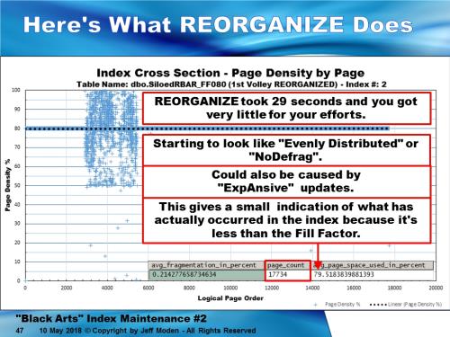 Paul Randal - Wednesday, October 10, 2018 5:40 PMAnd btw, reorganize doesn't cause page splits. Random inserts (or row expansions) cause page splits. Just because reorganize isn't lowering the amount of free space, that doesn't mean it's causing page splits, that means it's not helping to prevent page splits on those pages. That's a very, very different thing than it causing page splits.
