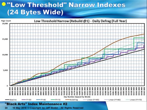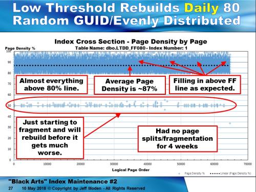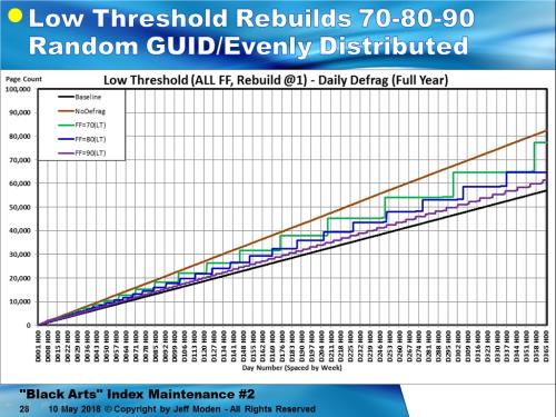 Further proof is in the pudding in the “Low ThresholdRebuild” line charts because they clearly show weeks-long periods of zero pagesplits (and, therefore, zero logical fragmentation) because the rebuilds add critical space above the Fill Factor, which Reorganize does not.