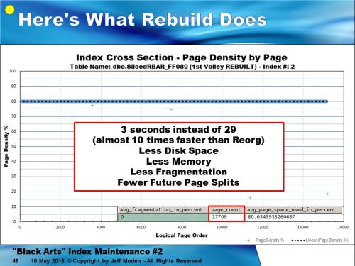 And here's what happens if you do a Rebuild, instead. And, it did it in a final page count less than what Reorganize did even though there's now extra space above the Fill Factor and pages below the Fill Factor have all been "combined" to hit the Fill Factor. I didn't check on this one but, considering what we saw on the 146MB index in the previous post, I'd have to say it used less log file, as well.
