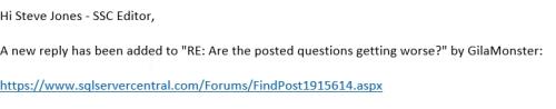Steve Jones - SSC Editor - Thursday, January 4, 2018 1:27 PMGilaMonster - Thursday, January 4, 2018 1:22 PMSteve, something changed in the notification emails?