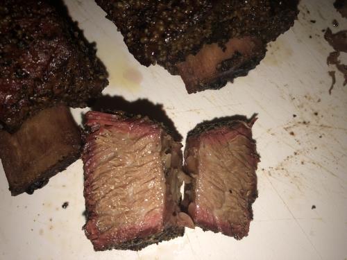 I tried smoking beef short ribs for the first time on July 4th. I have braised them in the oven plenty of times in the past but they were out of this world on the smoker. Look how moist and tender those are. And the smoke ring is dynamite.