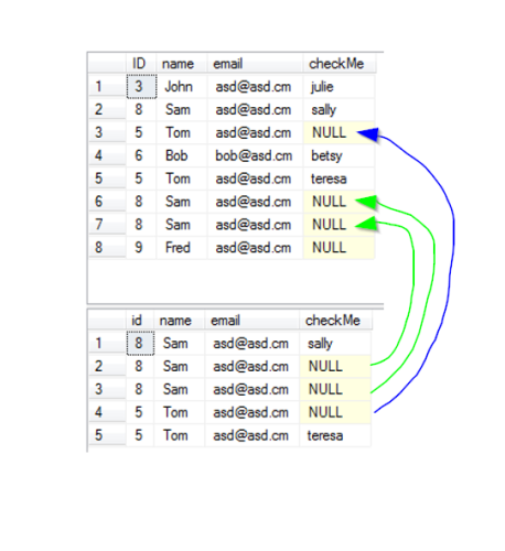 In the picture, the rows to delete from the table are marked with the poorly drawn lines from the temp table output at the bottom, to the original table output above it.