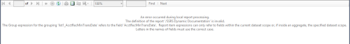 In the AcctRecMinTransDate TextBox there is this expression: =Fields!AcctRecMinTransDate.Value & " through " & Fields!AcctRecMaxTransDate.Value