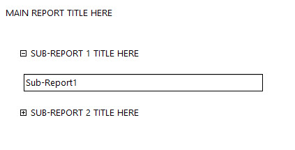 I sure hope this makes sense: I have one main report with three sub reports. There are three links on the main report to each of the sub reports. Clicking one of the links will display that sub report within the main report and only one sub report can be displayed at a time. I want the title of the sub report to appear in the main report's page header. We have custom code to do this but it is not working so am wondering if there is another way. I'm not an SSRS expert by any means so any is appreciated.