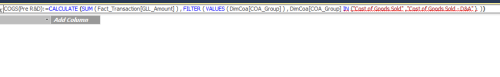 The DAX I am using for my measure is as follows COGS(Pre R&D):=CALCULATE (SUM ( Fact_Transaction[GLL_Amount] ) , FILTER ( VALUES ( DimCoa[COA_Group] ) , DimCoa[COA_Group] IN {"Cost of Goods Sold" ,"Cost of Goods Sold - D&A" } ))