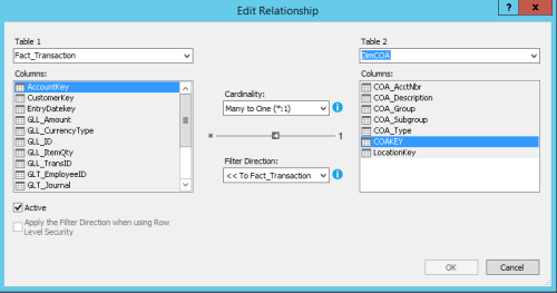 This table has a relationship to dimCOA, but when I attempt to use these dimension and fact tables in powerBI they show up blank. When looking at the tables this is based on in SSMS, the DIMCOA[COAKEY] field and the Fact_Transaction[Accountkey] Fields work for doing a SQL JOIN. I have atatched an image of the relationship between DimCOA and Fact_transaction in my tabular model.