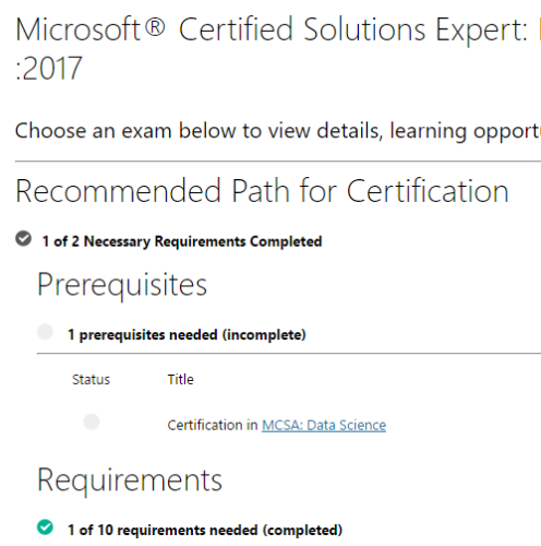 The first one needs a) MCSA in DataScience and b) doesnt talk about MCSA Datascience.And because i did 70-762 already, which is one of the prerequisite of 1 out of 10 exam requirements, it shows as "Completed" in my dashboart, and so, taking another exam 70-464 will not push forward in my path.