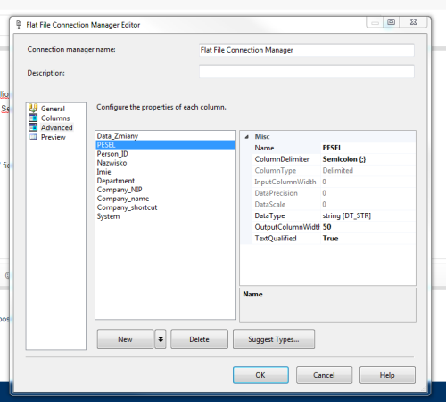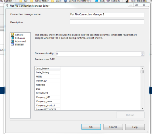 The given value of type String from the data source cannot be converted to type float of the specified target column:In Data conversion i have Data_Zmiany as Date (it is working), PESEL (11 digits), and Company_NIP (10 digits or null values) where my error shows up.