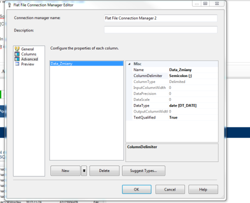 So I am deleting all fields, leaving only Data_Zmiany, changing string type to date and column delimeter is: